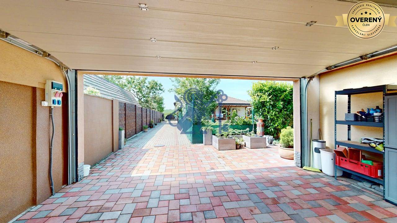 Vchod do dvora je cez súkromný príjazdový chodník na začiatku ktorého sa nachádza brána na diaľkové ovládanie (tepané umelecké dielo). Vedľa vstupu do domu sa nachádza otvorené garážové státie s možnosťou uzatvorenia automatickou bránou a zároveň prejazdom do záhrady. V zadnej časti pozemku sa nachádza samostatná drobná drevo-stavba – sklad (bicykle, záhradné náradie) s prístreškom. Dominantou záhrady je bazén vyhotovený vo vyššom štandarde. Bazén s proti-prúdom,má kvalitnú filtráciu, nočné osvetlenie a ohrevom vody tepelným čerpadlom. Je prekrytý kvalitným hliníkový prestrešením a tým je možné ho využívať aj za chladnejšieho obdobie (počas celého roka). Záhrada je udržiavaná, trávnik má funkčnú automatickú závlahu. Okrasná zeleň je dôsledne udržiavaná. Pozemok je v celom rozsahu oplotený s tým, že druh oplotenia zabezpečuje dostatok súkromia na dvore a aj v rodinnom dome.