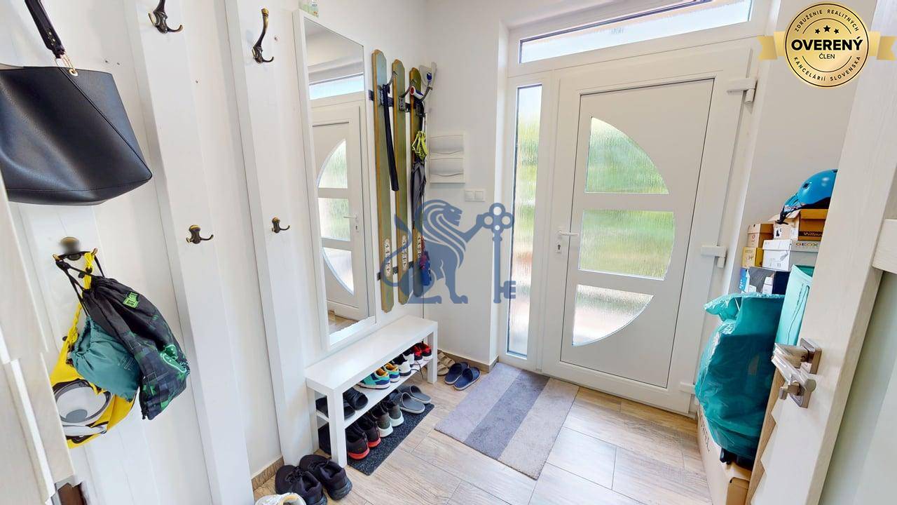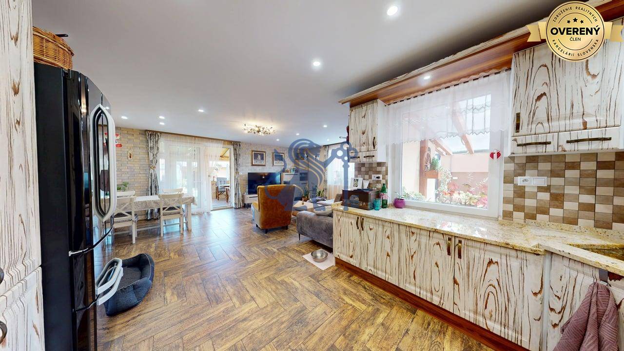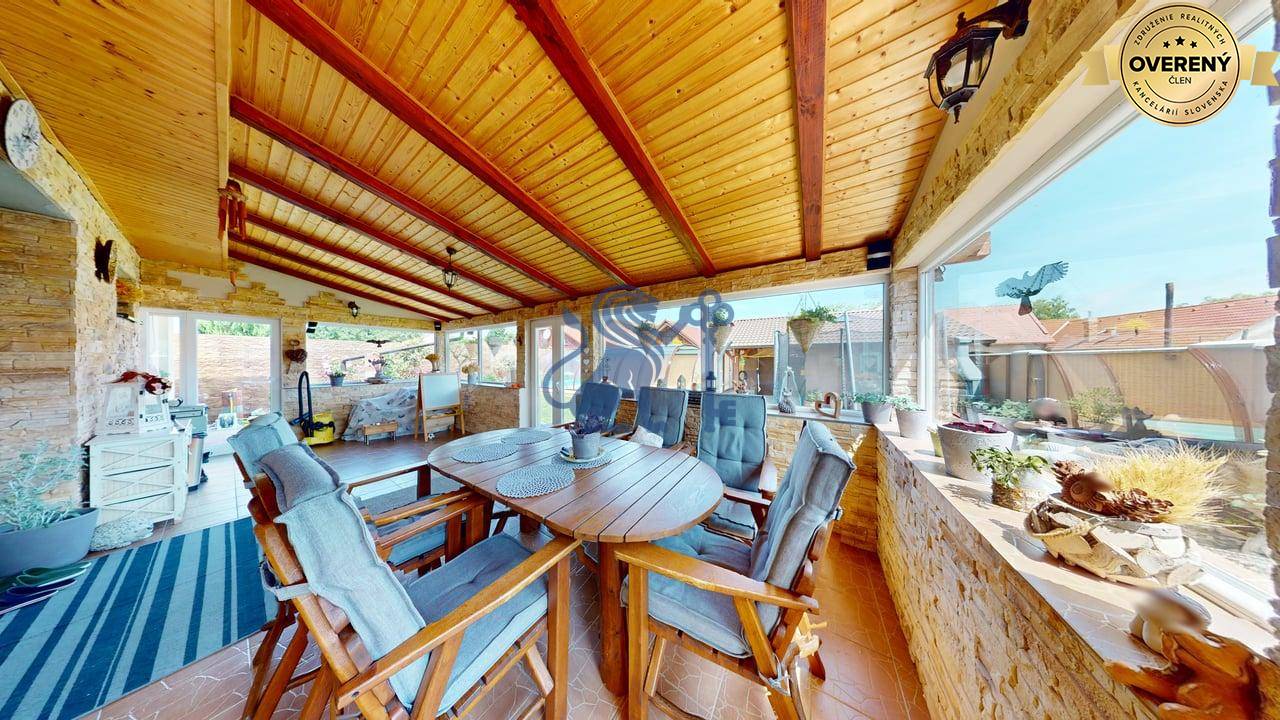 Jednopodlažný rodinný dom (bungalov) má celkovú výmeru pozemku 670m2, zastavanú plochu 173m2 a plochu záhrady a spevnených plôch 497m2. Otvorená dispozícia obývacej izby a kuchyne prepája interiér domu, cez zimnú záhradu na terasu, s exteriérom. Plne vybavená kuchyňa s jedálňou a obývaciu izbu prepojená so zimnou záhradou vytvárajú na bývanie príjemný priestor. Hlavná spálňa sa nachádza oproti dennej časti domu a dve spálne (detské izby) pri hlavnom vstupe. V dome sú dve kúpeľne a dve wc. Prvá kúpeľňa je s vaňou a druhá (aj ako technická miestnosť) s priestranným sprchovacím kútom. V dome je inštalovaná výkonná klimatizácia a kamerový systém. Kúrenie je podlahové a zdroj je plyn (plynový kondenzačný kotol).