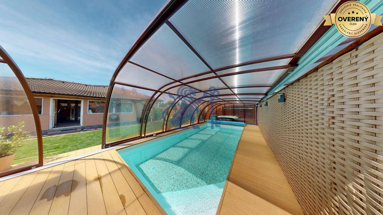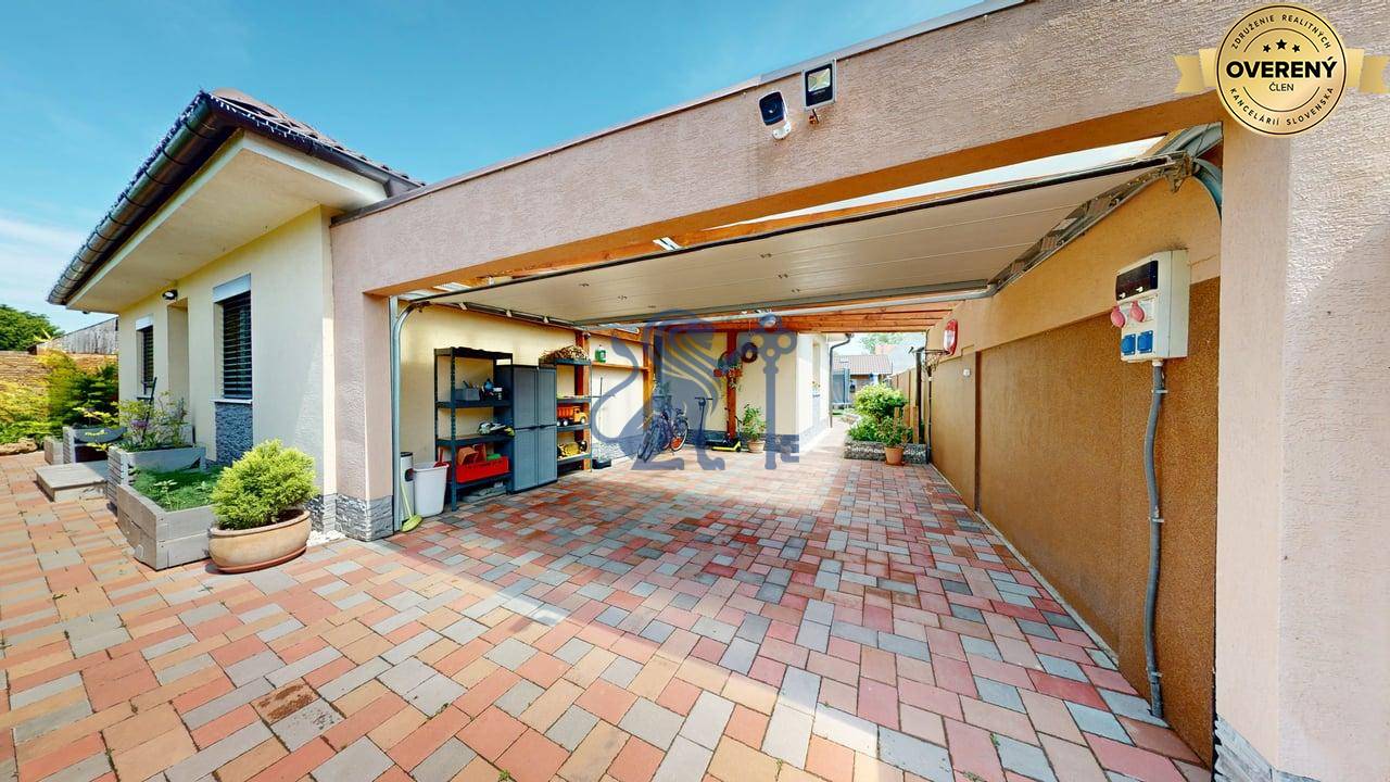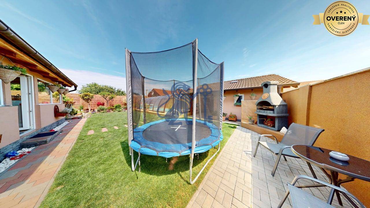 Vchod do dvora je cez súkromný príjazdový chodník na začiatku ktorého sa nachádza brána na diaľkové ovládanie (tepané umelecké dielo). Vedľa vstupu do domu sa nachádza otvorené garážové státie s možnosťou uzatvorenia automatickou bránou a zároveň prejazdom do záhrady. V zadnej časti pozemku sa nachádza samostatná drobná drevo-stavba – sklad (bicykle, záhradné náradie) s prístreškom. Dominantou záhrady je bazén vyhotovený vo vyššom štandarde. Bazén s proti-prúdom,má kvalitnú filtráciu, nočné osvetlenie a ohrevom vody tepelným čerpadlom. Je prekrytý kvalitným hliníkový prestrešením a tým je možné ho využívať aj za chladnejšieho obdobie (počas celého roka). Záhrada je udržiavaná, trávnik má funkčnú automatickú závlahu. Okrasná zeleň je dôsledne udržiavaná. Pozemok je v celom rozsahu oplotený s tým, že druh oplotenia zabezpečuje dostatok súkromia na dvore a aj v rodinnom dome.
