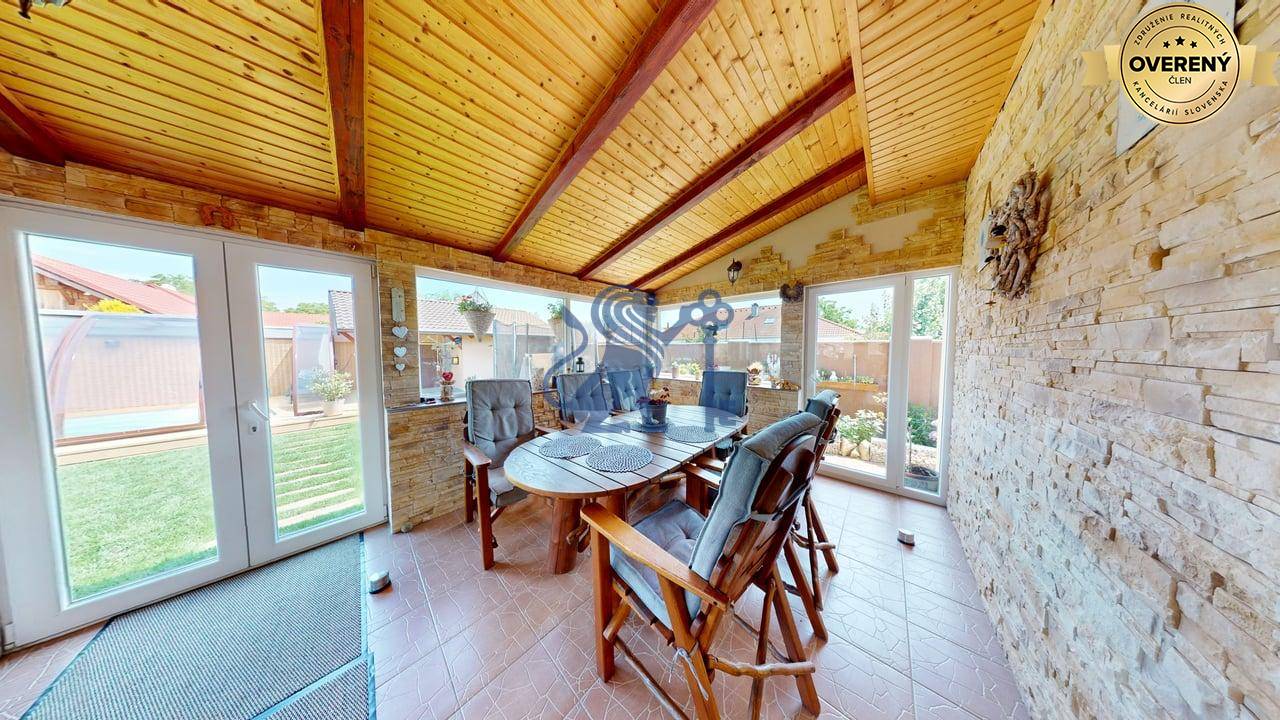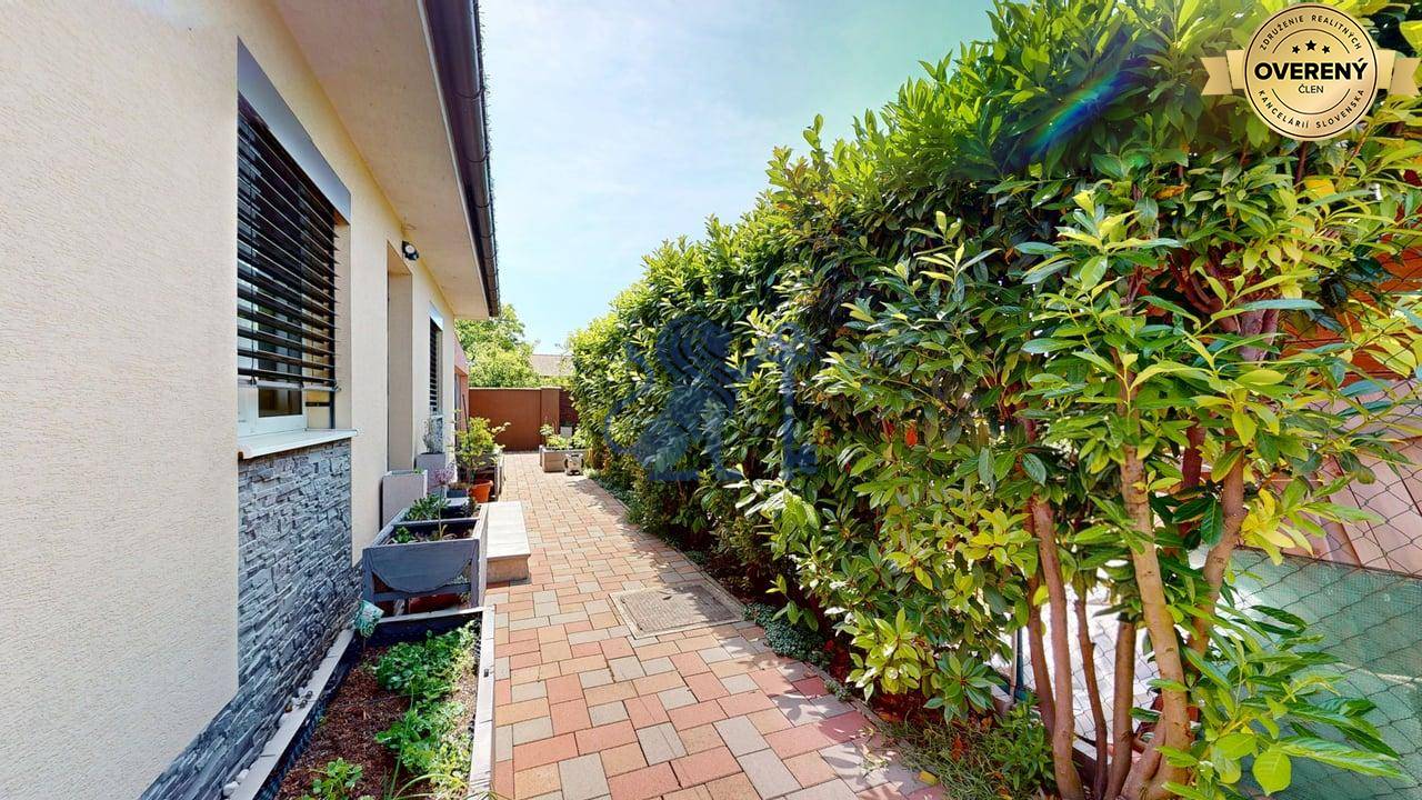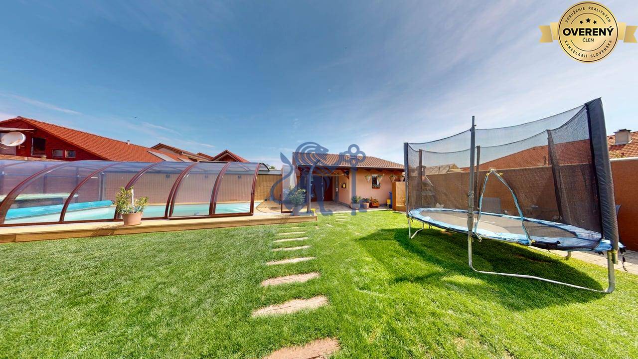 Jednopodlažný rodinný dom (bungalov) má celkovú výmeru pozemku 670m2, zastavanú plochu 173m2 a plochu záhrady a spevnených plôch 497m2. Otvorená dispozícia obývacej izby a kuchyne prepája interiér domu, cez zimnú záhradu na terasu, s exteriérom. Plne vybavená kuchyňa s jedálňou a obývaciu izbu prepojená so zimnou záhradou vytvárajú na bývanie príjemný priestor. Hlavná spálňa sa nachádza oproti dennej časti domu a dve spálne (detské izby) pri hlavnom vstupe. V dome sú dve kúpeľne a dve wc. Prvá kúpeľňa je s vaňou a druhá (aj ako technická miestnosť) s priestranným sprchovacím kútom. V dome je inštalovaná výkonná klimatizácia a kamerový systém. Kúrenie je podlahové a zdroj je plyn (plynový kondenzačný kotol).