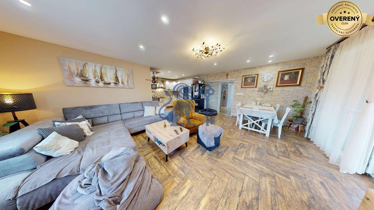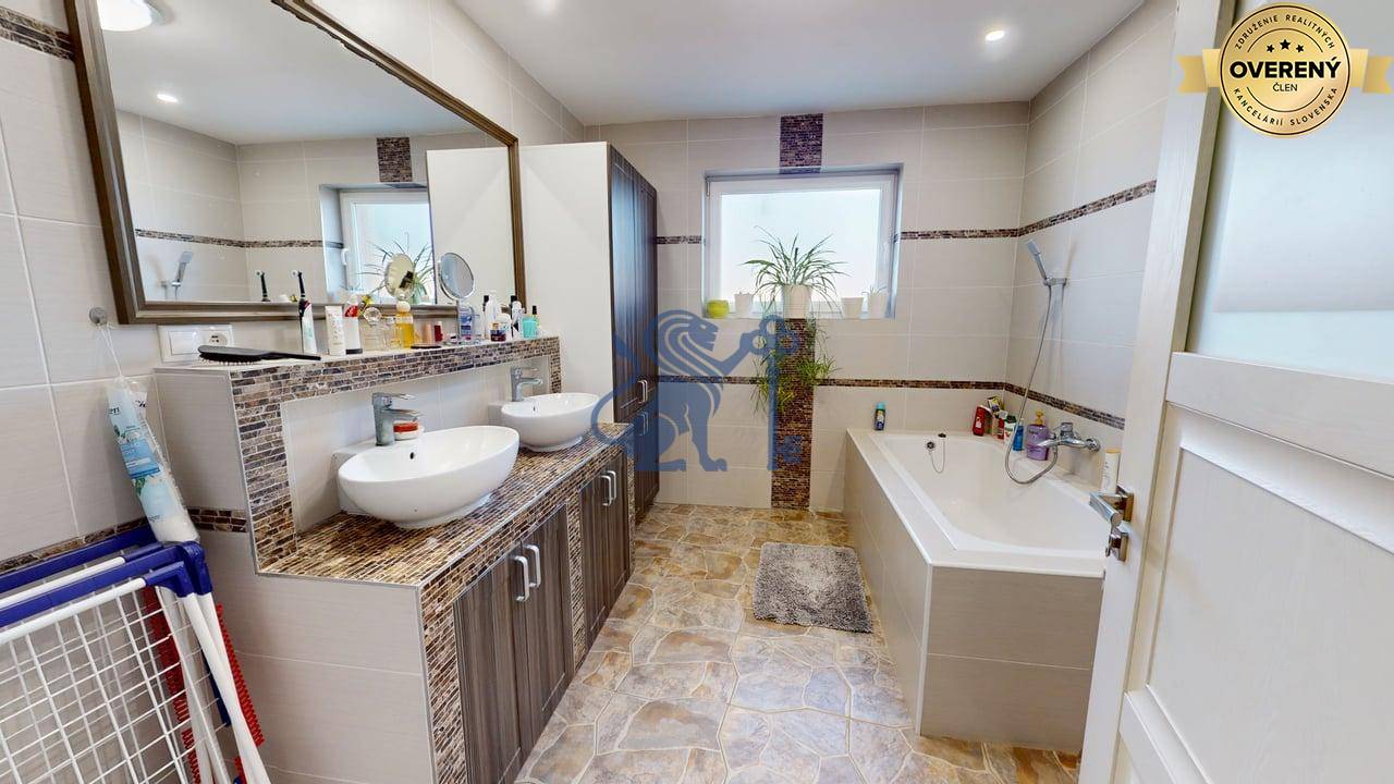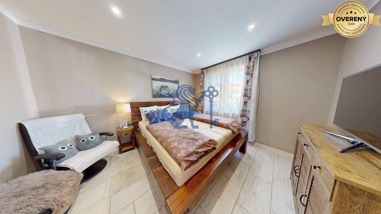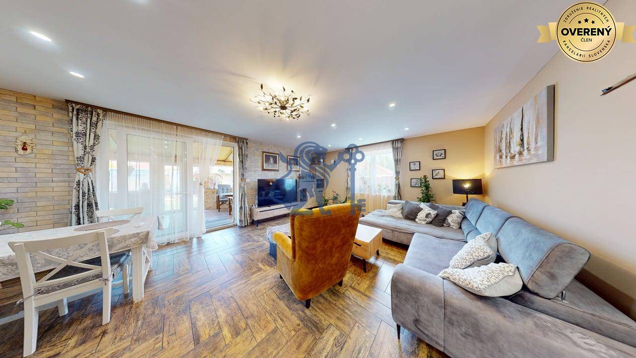 Jednopodlažný rodinný dom (bungalov) má celkovú výmeru pozemku 670m2, zastavanú plochu 173m2 a plochu záhrady a spevnených plôch 497m2. Otvorená dispozícia obývacej izby a kuchyne prepája interiér domu, cez zimnú záhradu na terasu, s exteriérom. Plne vybavená kuchyňa s jedálňou a obývaciu izbu prepojená so zimnou záhradou vytvárajú na bývanie príjemný priestor. Hlavná spálňa sa nachádza oproti dennej časti domu a dve spálne (detské izby) pri hlavnom vstupe. V dome sú dve kúpeľne a dve wc. Prvá kúpeľňa je s vaňou a druhá (aj ako technická miestnosť) s priestranným sprchovacím kútom. V dome je inštalovaná výkonná klimatizácia a kamerový systém. Kúrenie je podlahové a zdroj je plyn (plynový kondenzačný kotol).
