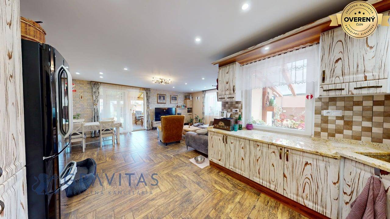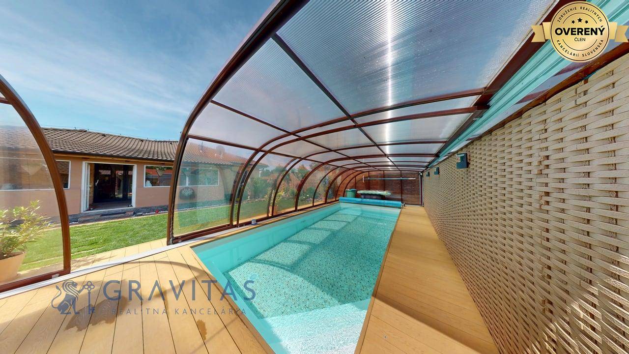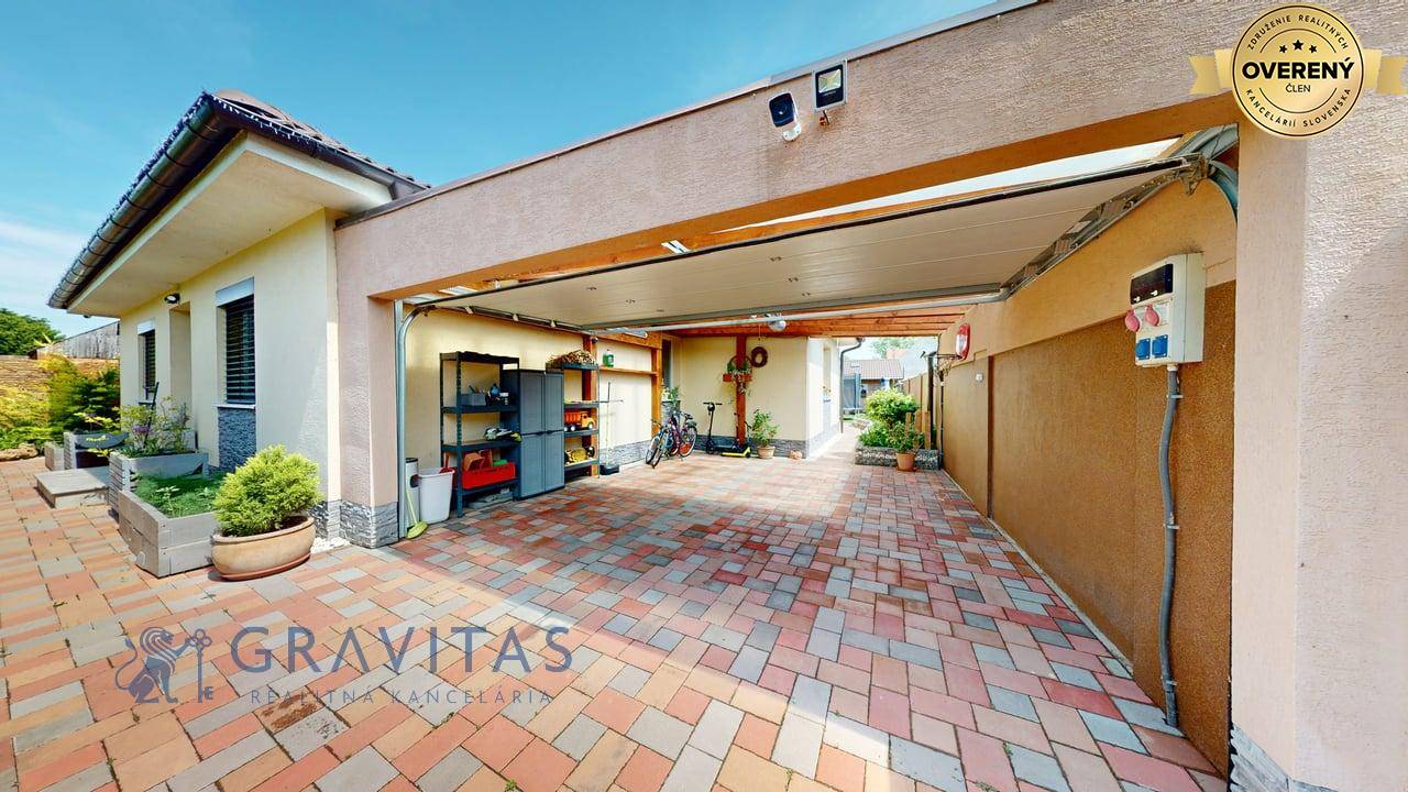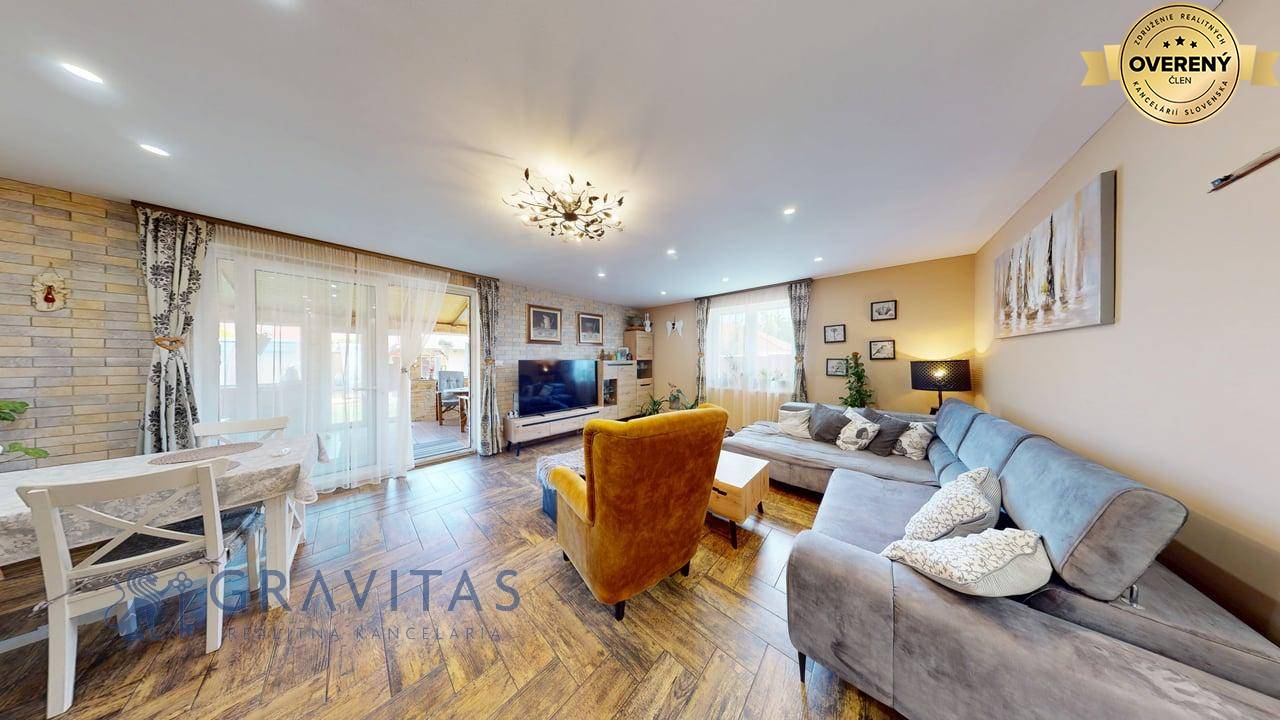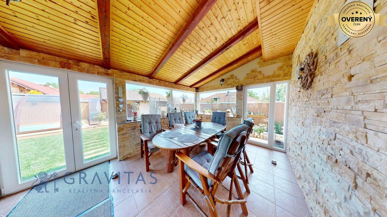 Jednopodlažný rodinný dom (bungalov) má celkovú výmeru pozemku 670m2, zastavanú plochu 173m2 a plochu záhrady a spevnených plôch 497m2. Otvorená dispozícia obývacej izby a kuchyne prepája interiér domu, cez zimnú záhradu na terasu, s exteriérom. Plne vybavená kuchyňa s jedálňou a obývaciu izbu prepojená so zimnou záhradou vytvárajú na bývanie príjemný priestor. Hlavná spálňa sa nachádza oproti dennej časti domu a dve spálne (detské izby) pri hlavnom vstupe. V dome sú dve kúpeľne a dve wc. Prvá kúpeľňa je s vaňou a druhá (aj ako technická miestnosť) s priestranným sprchovacím kútom. V dome je inštalovaná výkonná klimatizácia a kamerový systém. Kúrenie je podlahové a zdroj je plyn (plynový kondenzačný kotol).
