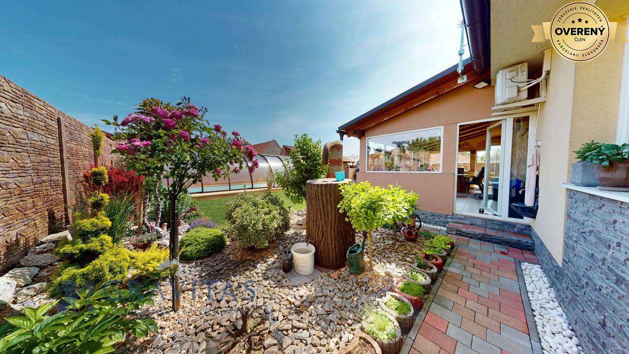 Vchod do dvora je cez súkromný príjazdový chodník na začiatku ktorého sa nachádza brána na diaľkové ovládanie (tepané umelecké dielo). Vedľa vstupu do domu sa nachádza otvorené garážové státie s možnosťou uzatvorenia automatickou bránou a zároveň prejazdom do záhrady. V zadnej časti pozemku sa nachádza samostatná drobná drevo-stavba – sklad (bicykle, záhradné náradie) s prístreškom. Dominantou záhrady je bazén vyhotovený vo vyššom štandarde. Bazén s proti-prúdom,má kvalitnú filtráciu, nočné osvetlenie a ohrevom vody tepelným čerpadlom. Je prekrytý kvalitným hliníkový prestrešením a tým je možné ho využívať aj za chladnejšieho obdobie (počas celého roka). Záhrada je udržiavaná, trávnik má funkčnú automatickú závlahu. Okrasná zeleň je dôsledne udržiavaná. Pozemok je v celom rozsahu oplotený s tým, že druh oplotenia zabezpečuje dostatok súkromia na dvore a aj v rodinnom dome.