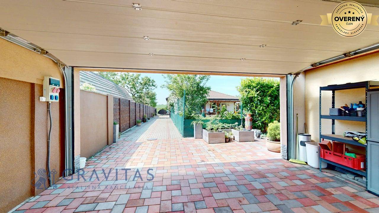 Vchod do dvora je cez súkromný príjazdový chodník na začiatku ktorého sa nachádza brána na diaľkové ovládanie (tepané umelecké dielo). Vedľa vstupu do domu sa nachádza otvorené garážové státie s možnosťou uzatvorenia automatickou bránou a zároveň prejazdom do záhrady. V zadnej časti pozemku sa nachádza samostatná drobná drevo-stavba – sklad (bicykle, záhradné náradie) s prístreškom. Dominantou záhrady je bazén vyhotovený vo vyššom štandarde. Bazén s proti-prúdom,má kvalitnú filtráciu, nočné osvetlenie a ohrevom vody tepelným čerpadlom. Je prekrytý kvalitným hliníkový prestrešením a tým je možné ho využívať aj za chladnejšieho obdobie (počas celého roka). Záhrada je udržiavaná, trávnik má funkčnú automatickú závlahu. Okrasná zeleň je dôsledne udržiavaná. Pozemok je v celom rozsahu oplotený s tým, že druh oplotenia zabezpečuje dostatok súkromia na dvore a aj v rodinnom dome.