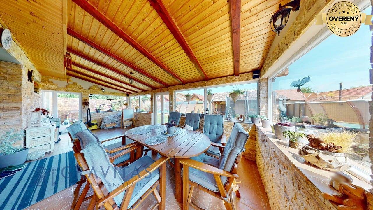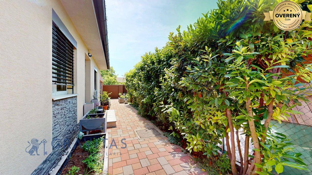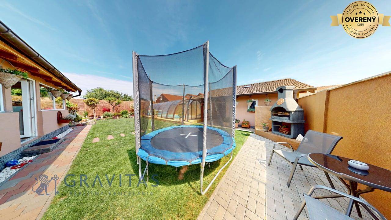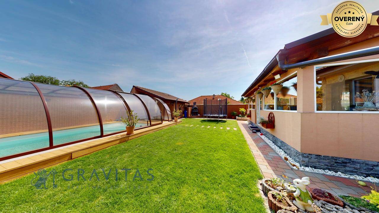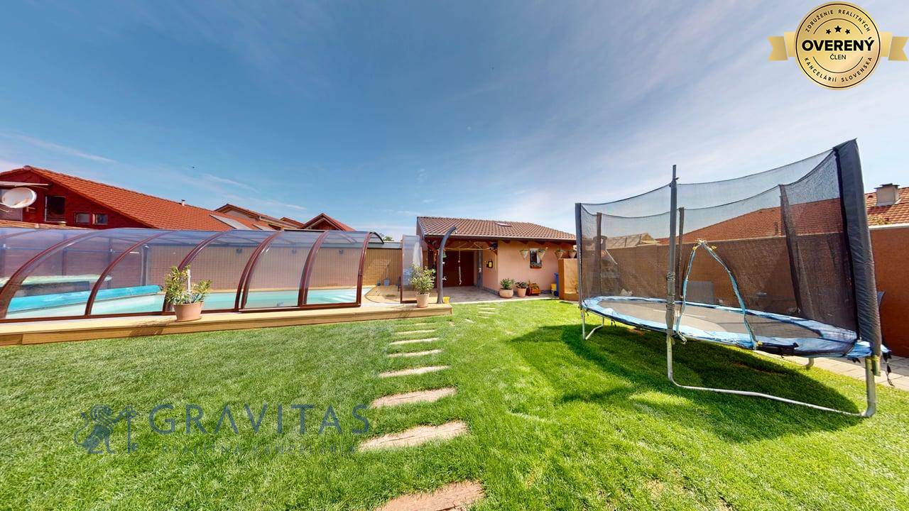 Jednopodlažný rodinný dom (bungalov) má celkovú výmeru pozemku 670m2, zastavanú plochu 173m2 a plochu záhrady a spevnených plôch 497m2. Otvorená dispozícia obývacej izby a kuchyne prepája interiér domu, cez zimnú záhradu na terasu, s exteriérom. Plne vybavená kuchyňa s jedálňou a obývaciu izbu prepojená so zimnou záhradou vytvárajú na bývanie príjemný priestor. Hlavná spálňa sa nachádza oproti dennej časti domu a dve spálne (detské izby) pri hlavnom vstupe. V dome sú dve kúpeľne a dve wc. Prvá kúpeľňa je s vaňou a druhá (aj ako technická miestnosť) s priestranným sprchovacím kútom. V dome je inštalovaná výkonná klimatizácia a kamerový systém. Kúrenie je podlahové a zdroj je plyn (plynový kondenzačný kotol).